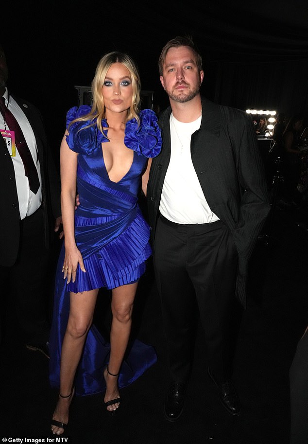 Laura Whitmore put on a leggy display in a cobalt blue dress as she and her husband Iain Stirling attended the 2024 MTV Video Music Awards in New York on Wednesday.