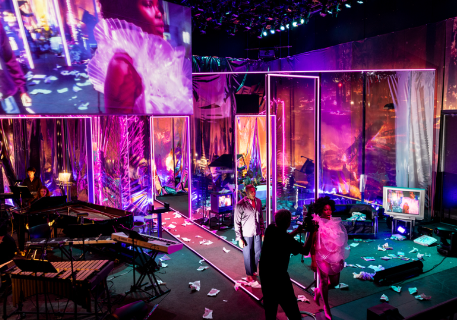 At MIT, Machover collaborated with theater director Jay Scheib, Class of 1949 Professor of Music and Theater Arts, whose augmented reality theater productions have long probed the confused border between the simulacra and the real. “We took camera feeds of live action, process the signal and then project it back, like a strange film, on a variety of surfaces, both TV- and screen-like but also diaphonous and translucent,” says Scheib, “It’s lots and lots of images accumulating at a really high speed, and a mix of choreography and styles of film acting, operatic acting.” Against an innovative set designed by Oana Botez, lighting by Yuki Link, and media by Peter A. Torpey PhD ’13, actors played multiple characters as time splinters and refracts. “Reality is constantly shifting,” says Scheib.