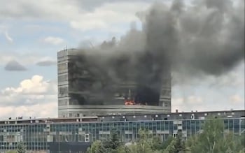 Two people jumped to their deaths from the top floors of a burning eight-storey research centre near Moscow that develops components for Russian fighter jets and air defence systems.
