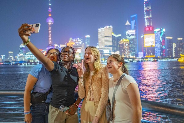 Students of a delegation from Muscatine High School visiting China pose for a picture in the Bund,Shanghai,April 23,2024. (Photo by Wang Chu/People's Daily Online)