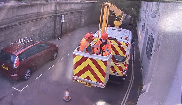 Footage captured by CCTV cameras showed the cherry picker van with two men dressed in orange high-vis clothing and helmets.