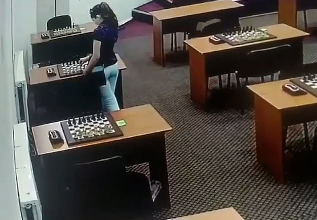 Amina Abakarova,43,was filmed as she walked into the tournament hall of the Dagestan Chess Championship in Makhachkala,southern Russia,last Friday and took what appeared to be a vial out of her bag.