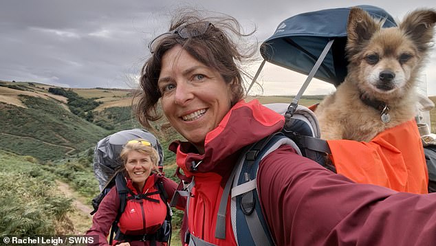 Wives Rachel Leigh,34,and Jill Pearson,36,are hiking the South West Coast Path - England's longest marked footpath with Pomeranian cross Arnie.