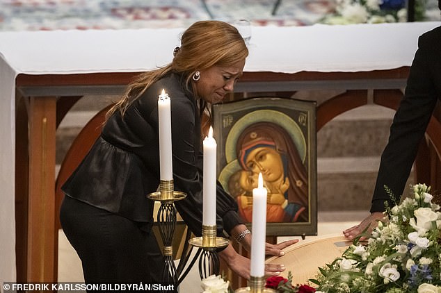 The woman who had shared her life with Sven-Goran Eriksson for 16 years broke down in tears this morning as she touched his coffin at his funeral in Sweden today.