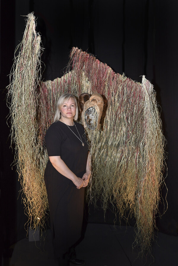 Máret Ánne Sara (1983-) with her artwork at the exhibition “Environmental Injustice – Indigenous Peoples’ Alternatives” (2021-2022) at Musée d’ethnographie de Genève (MEG),Switzerland 2021 MEG Inv. ETHPH 90345 © Photo Johnathan Watts,MEG