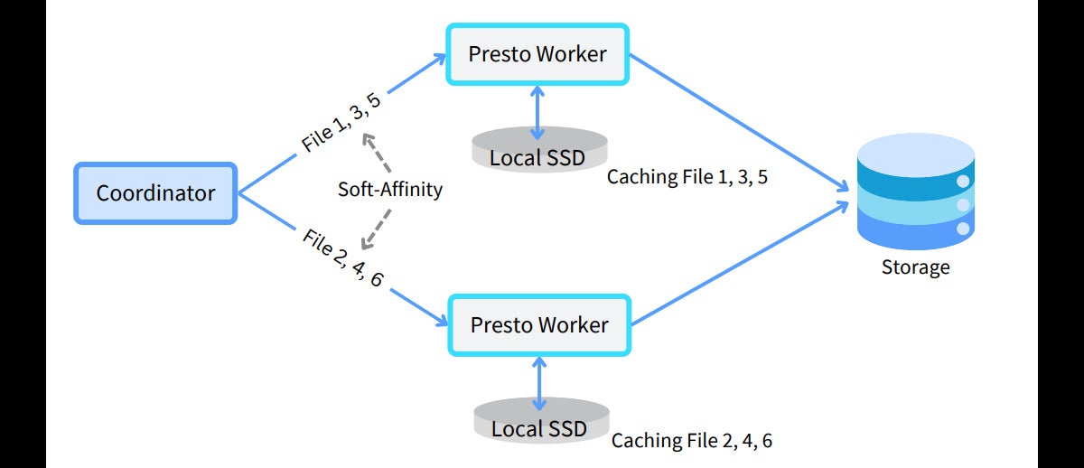 The diagram above shows the soft-affinity node selection architecture. Soft-affinity scheduling attempts to send requests to workers based on file paths, maximizing cache hits by locating data in worker caches. Soft affinity is “soft” because it is not a strict rule—if the preferred worker is busy, the split is sent to another available worker rather than waiting.