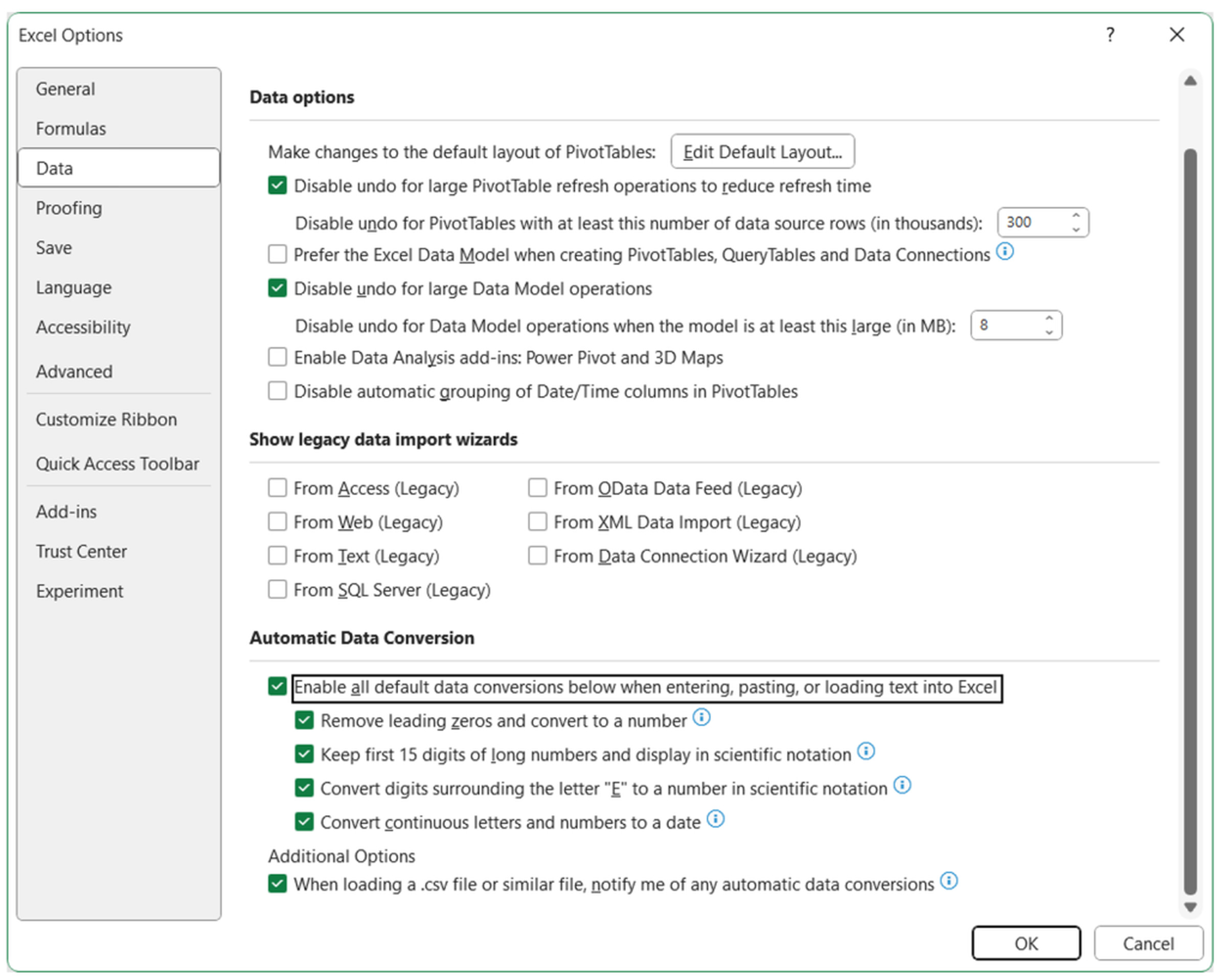Microsoft’s blog adds caveats, such as that Excel avoids the conversion by saving the data as text, which means the data may not work for calculations later. There’s also a known issue where you can’t disable the conversions when running macros.