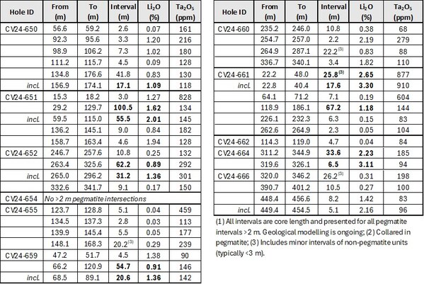 44.3 m at 1.47% Li2O and 58.1 m at 1.21% Li2O (CV24-591).