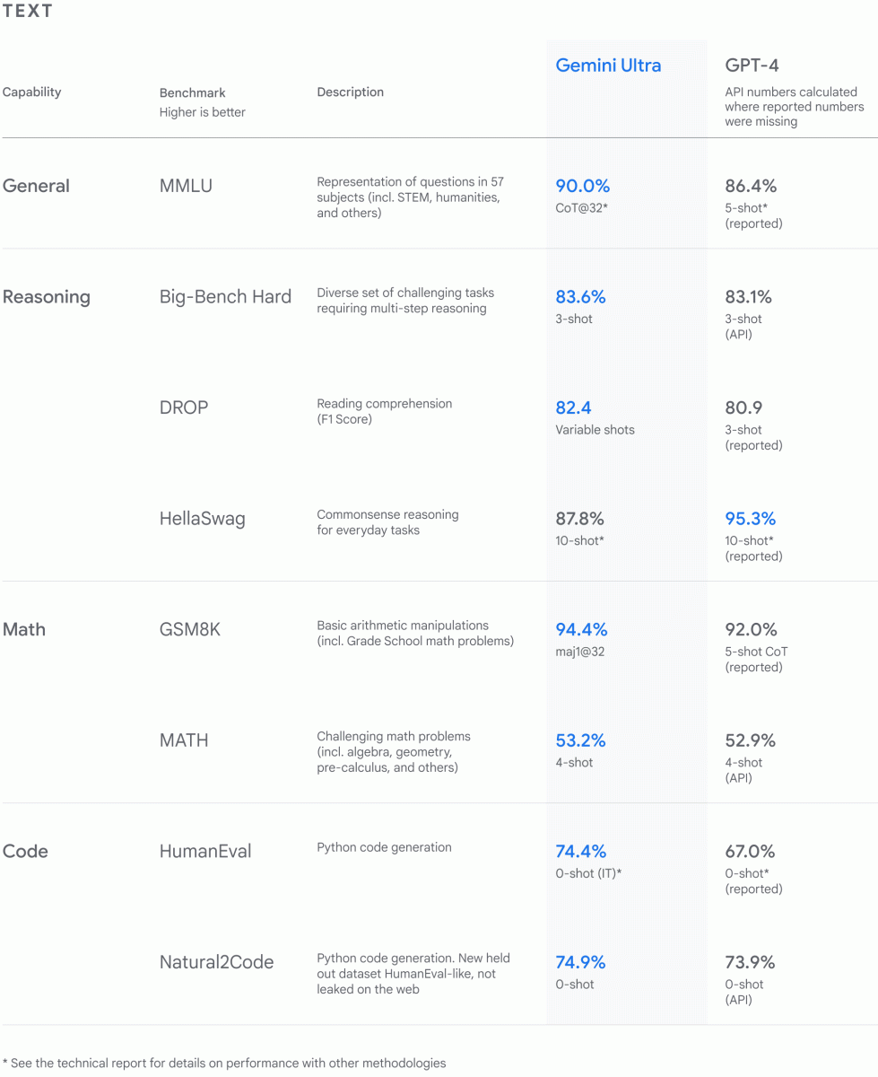 Something that Google was keen to highlight at the launch of Gemini Ultra was that the language model outperformed the latest version of OpenAI’s GPT-4 in 30 of the 32 most commonly used tests to measure the capabilities of language models. The tests cover everything from reading comprehension and various math questions to writing code for Python and image analysis. In some of the tests, the difference between the two AI models was only a few tenths of a percentage point, while in others it was up to ten percentage points.