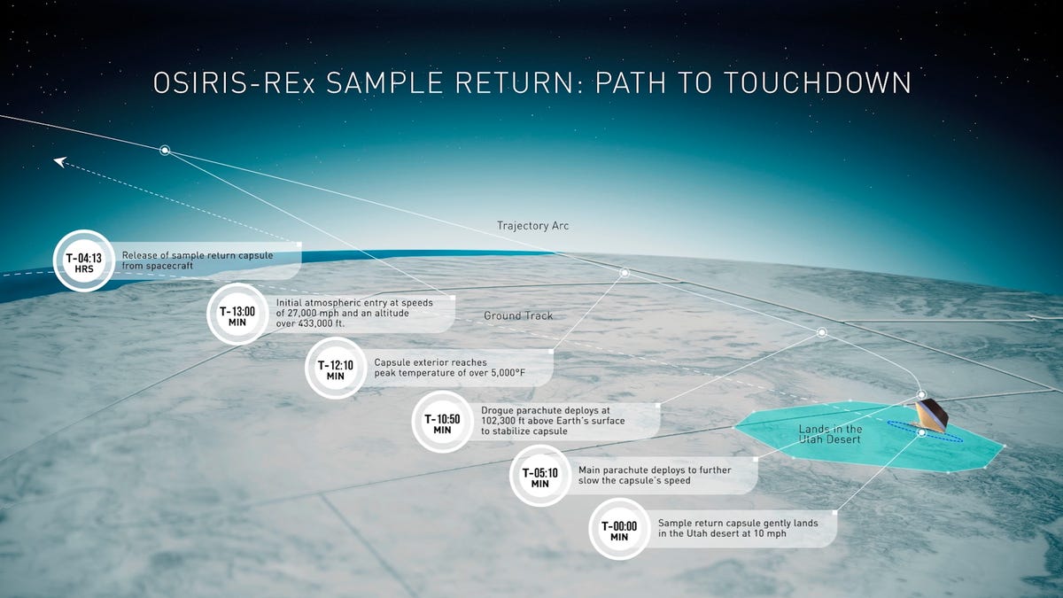 This graphic shows the events that happen between the time the Osiris-Rex spacecraft releases its sample capsule to the time the capsule lands in the Utah desert.