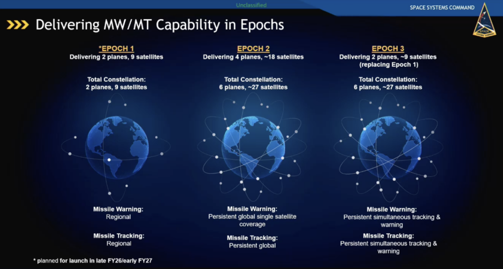 The first nine satellites of a medium Earth orbit (MEO) missile-warning and missile-tracking constellation, called Epoch 1, are projected to launch in 2027. A second procurement of 18 satellites, called Epoch 2, will follow two to three years later, Bogstie said Oct. 19 at the MilSat Symposium in Mountain View, California.