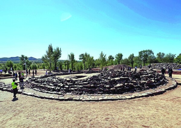 The round rubble mound tomb of the Yuanbaoshan archaeological site in Aohan Banner of Chifeng,Inner Mongolia autonomous region,is found during a four-month salvage excavation earlier this year. FANG AIQING/CHINA DAILY